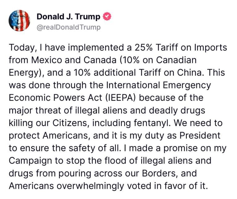 अमेरिका के राष्ट्रपति डोनाल्ड ट्रंप ने मेक्सिको, कनाडा और चीन से आयात पर शुल्क लगा दिया है। राष्ट्रपति ट्रंप ने कल रात तीन कार्यकारी आदेशों पर हस्ताक्षर किए। अब मैक्सिको से आयात पर 25 प्रतिशत तथा दूसरे आदेश से कनाडा से आयात पर 25 प्रतिशत और ऊर्जा स्रोतों पर 10 प्रतिशत शुल्क लगाया गया है। वहीं, चीन से आयात पर अतिरिक्त दस प्रतिशत शुल्क लगाए जाने का अनुमोदन किया गया है।
