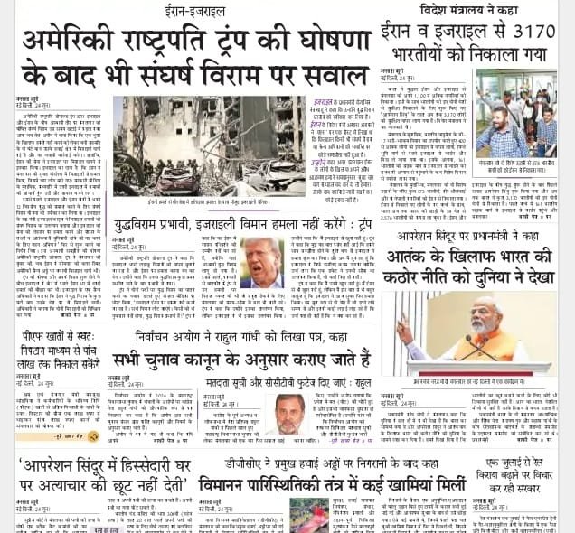 ईरान-इस्राइल संघर्ष विराम से जुड़े समाचार अख़बारों ने प्रमुखता से दिए हैं। हिन्दुस्तान की सुर्खी है- संशय के बीच संघर्ष विराम। भारत और रूस समेत अनेक देशों ने स्वागत किया। देशबंधु के अनुसार- इस्राइल-ईरान संघर्ष के चलते देशभर में साठ से ज्यादा उड़ानें रद्द हुईं।