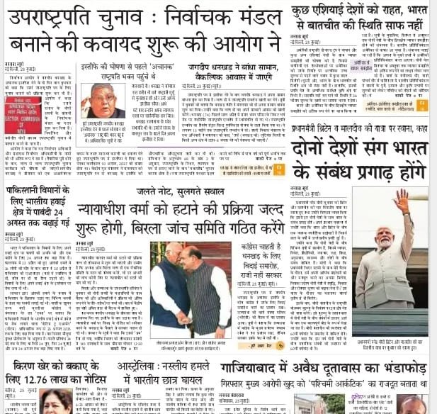 उप-राष्ट्रपति जगदीप धनखड़ के इस्तीफे के बाद निर्वाचन आयोग द्वारा नए उप-राष्ट्रपति चुने जाने के लिए निर्वाचन प्रक्रिया शुरू करने की खबर को ज्यादातर अखबारों ने अपनी सुर्खी बनाया है।