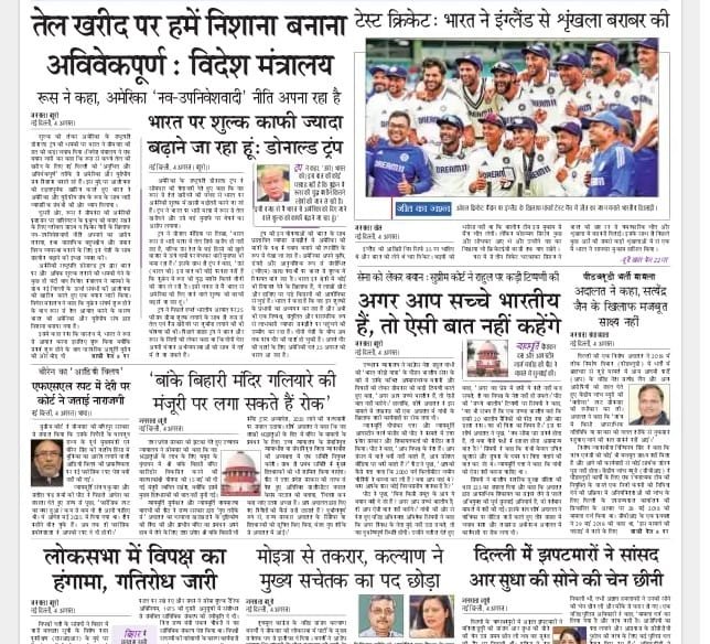 अमरीका के राष्ट्रपति डॉनल्ड ट्रंप की भारत पर और अधिक शुल्क लगाने की धमकी पर भारत के पलटवार को आज के सभी समाचार पत्रों ने अपनी प्रमुख खबर बनाया है। विदेश मंत्रालय का बयान-तेल खरीद पर हमें निशाना बनाना अविवेकपूर्ण जनसत्ता की पहली खबर है। उधर राजस्थान पत्रिका बौखलाहट शीर्षक से लिखता है- रूस से तेल खरीद पर नाराज अमरीकी राष्ट्रपति, भारत ने कहा- अमरीका खुद खरीद रहा रूस से समान। दैनिक भास्कर लिखता है-ट्रंप ने घेरा तो भारत का दो-टूक जवाब, अमरीका भी तो रूस से यूरेनियम खाद ले रहा है।