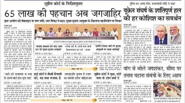 निर्वाचन आयोग द्वारा बिहार में मसौदा मतदाता सूची से हटाए गए 65 लाख लोगों के नाम सार्वजनिक किए जाने को सभी अखबारों ने पहले पन्ने पर दिया है। जनसत्ता की सुर्खी है- सुप्रीम कोर्ट के निर्देशानुसार 65 लाख की पहचान अब जगजाहिर। वहीं दैनिक ट्रिब्यून ने लिखा है- मुख्य निर्वाचन आयुक्त के खिलाफ विपक्ष की महाभियोग नोटिस की तैयारी।