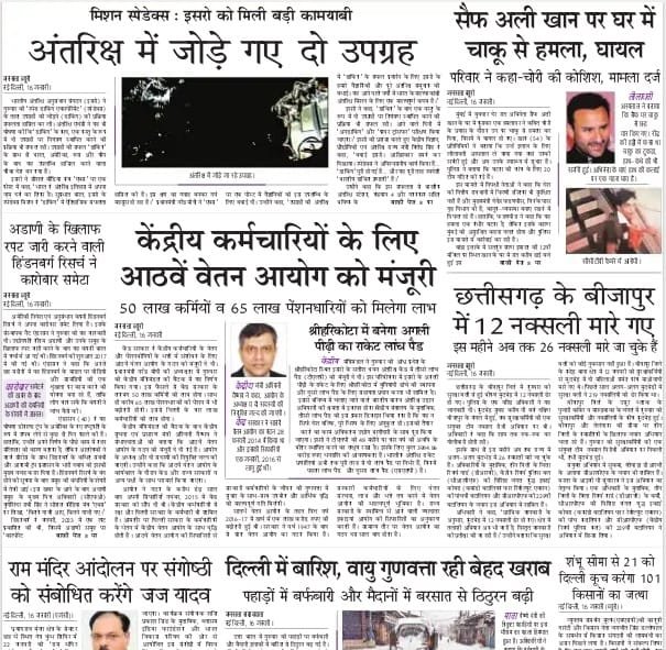 इसरो द्वारा पहली बार अंतरिक्ष में उपग्रहों की सफल डॉकिंग कराकर ऐतिहासिक सफलता प्राप्त करने का समाचार भी सभी अखबारों में है। दैनिक ट्रिब्यून लिखता है – भारत ने रचा इतिहास, अंतरिक्ष में जोडे दो उपग्रह।