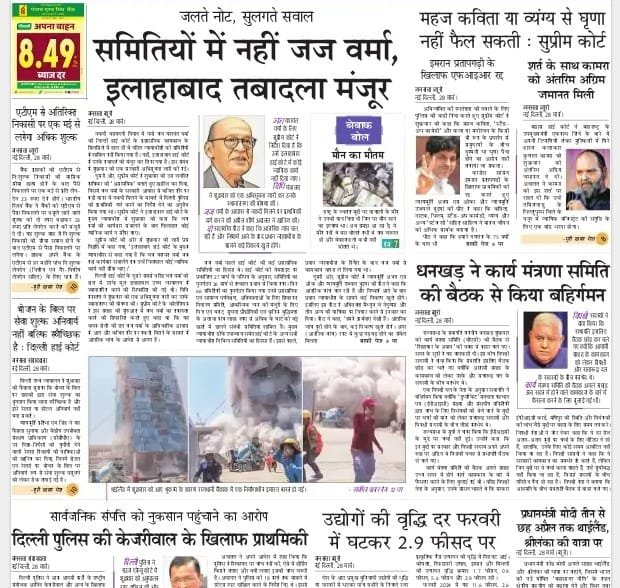 म्यामां और थाईलैंड में आए शक्तिशाली भूकम्प की खबर को अखबारों ने सचित्र दिया है। राजस्थान पत्रिका के शब्द हैं – म्यामां, थाईलैंड में जलजला, 7 दशमलव 7 तीव्रता के झटके, कई लोगों की मौत। दैनिक भास्कर की सुर्खी है – पहली मई से एटीएम से प्री लिमिट के बाद हर ट्रांजैक्शन पर 23 रुपये कटेंगे।