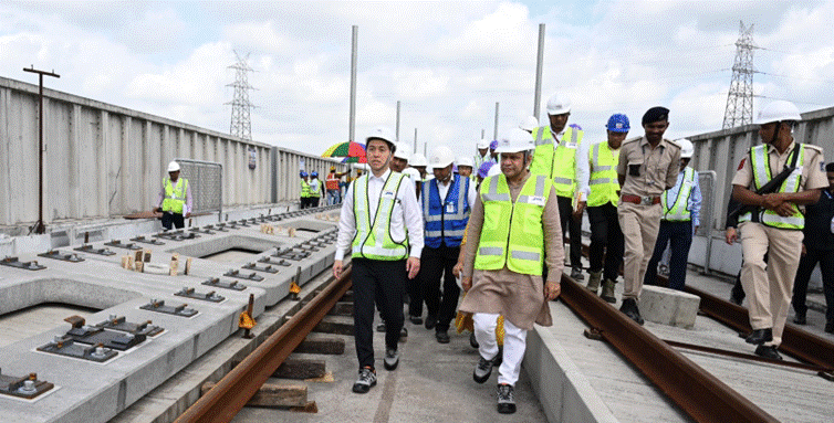 सूरत में ट्रैक स्लैब बिछाने के स्थल का दौरा: दोनों मंत्रियों ने सूरत हाई-स्पीड रेल स्थल पर ट्रैक निर्माण स्थल का दौरा किया, जहाँ उन्होंने वायडक्ट पर जे-स्लैब गिट्टी रहित ट्रैक प्रणाली की स्थापना का काम देखा। ट्रैक स्लैब की स्थापना और स्थायी रेल ट्रैक बिछाने का कार्य तेजी से चल रहा है।