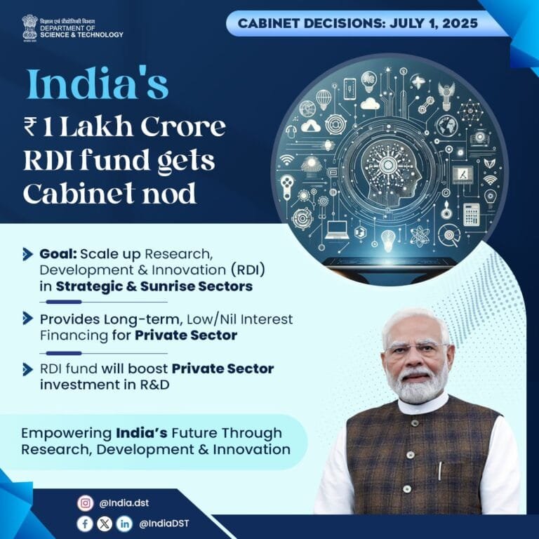 भारत के अनुसंधान और नवोन्मेषण इको-सिस्टम को सुदृढ़ करने के लिए एक रूपांतरणकारी कदम के रूप में प्रधानमंत्री नरेन्द्र मोदी की अध्यक्षता में केंद्रीय मंत्रिमंडल ने आज एक लाख करोड़ रुपये की राशि के साथ अनुसंधान विकास और नवोन्मेषण (आरडीआई) योजना को मंजूरी दी है।
