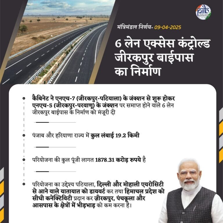 प्रधानमंत्री नरेन्द्र मोदी की अध्यक्षता में आर्थिक मामलों की मंत्रिमंडल समिति ने पंजाब और हरियाणा राज्य में एनएच (ओ) के तहत हाइब्रिड एन्युटी मोड पर एनएच-7 (जीरकपुर-पटियाला) के साथ जंक्शन से शुरू होकर एनएच-5 (जीरकपुर-परवाणू) के साथ जंक्शन पर समाप्त होने वाले 6 लेन जीरकपुर बाईपास के निर्माण को मंजूरी दे दी है, जिसकी कुल लंबाई 19.2 किलोमीटर है। यह पीएम गतिशक्ति राष्ट्रीय मास्टर प्लान सिद्धांत के तहत एकीकृत परिवहन इन्फ्रास्ट्रक्चर के विकास को सुविधाजनक बनाने के लिए एक महत्वपूर्ण कदम है।