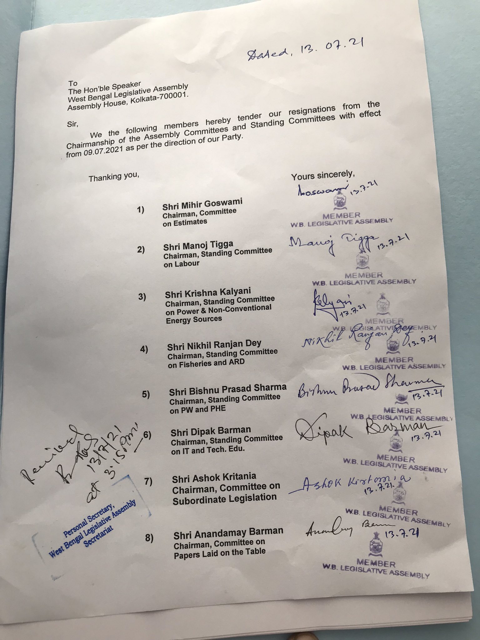पश्चिम बंगाल में भारतीय जनता पार्टी के आठ विधायकों ने आज राज्य विधानसभा की विभिन्न समितियों और स्थायी समितियों के अध्यक्ष पदों से इस्तीफे दे दिए। आज तीसरे पहर असेम्बली हाउस में भारतीय जनता पार्टी लेजिस्लेटिव पार्टी की बैठक में हिस्सा लेने के बाद ये विधायक राजभवन में राज्यपाल से मिलने गए। विपक्ष के नेता भाजपा के शुभेंदु अधिकारी ने बाद में पत्रकारों को बताया कि मुकुल राय को लोक लेखा समिति का अध्यक्ष बनाया गया था, भले ही वे अपनी पूर्ववर्ती तृणमूल कांग्रेस में फिर से शामिल हो गए थे। मुकुल राय ने टीएमसी में लौटने के बावजूद विधायक पद से इस्तीफा नहीं दिया था। शुभेंदु अधिकारी ने कहा कि वे लोक लेखा समिति के अध्यक्ष पद को लेकर टीएमसी द्वारा की गई राजनीति का कड़ा विरोध करते हैं और उन्होंने इस मामले में राज्यपाल से हस्तक्षेप की मांग की।