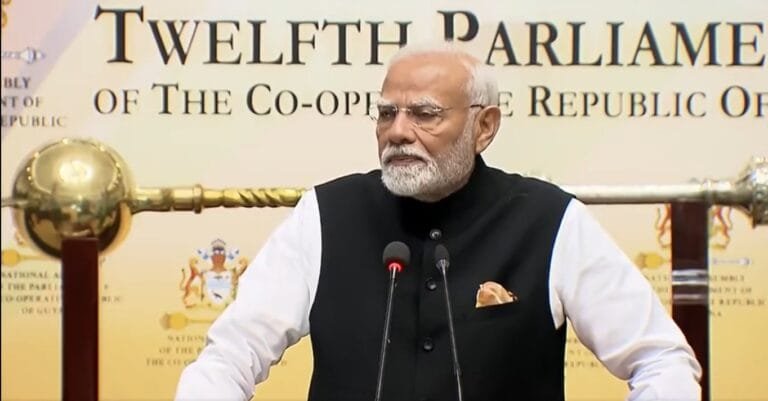 प्रधानमंत्री नरेंद्र मोदी ने गयाना की संसद के विशेष सत्र को संबोधित किया। उन्होंने कहा, “भारत और गयाना का रिश्ता बहुत गहरा है, यह मिट्टी, पसीने और परिश्रम का रिश्ता है। करीब 180 साल पहले एक भारतीय गयाना की धरती पर आया था और उसके बाद से खुशी और गम दोनों ही स्थितियों में भारत और गयाना का रिश्ता आत्मीयता से भरा रहा है।”