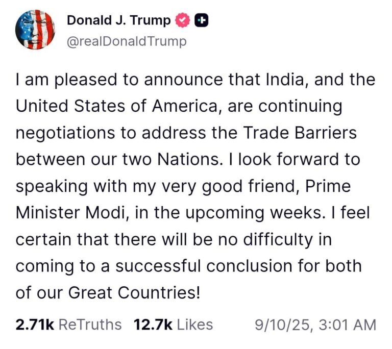 प्रधानमंत्री मोदी ने अमेरिका के राष्ट्रपति डॉनल्ड ट्रम्प के सोशल मीडिया एक्स पर की गई एक पोस्ट का उत्तर देते हुए कहा: “भारत और अमेरिका घनिष्ठ मित्र और स्वाभाविक साझेदार हैं। मुझे विश्वास है कि हमारी व्यापार वार्ता भारत-अमेरिका साझेदारी की असीम संभावनाओं को प्रदर्शित करने का मार्ग प्रशस्त करेगी। हमारी टीम इन चर्चाओं को शीघ्र अति शीघ्र पूरा करने के लिए काम कर रही हैं। मैं राष्ट्रपति ट्रम्प से बात करने के लिए भी उत्सुक हूँ। हम अपने दोनों देशों के लोगों के उज्जवल और समृद्ध भविष्य को सुरक्षित करने के लिए मिलकर काम करेंगे।
