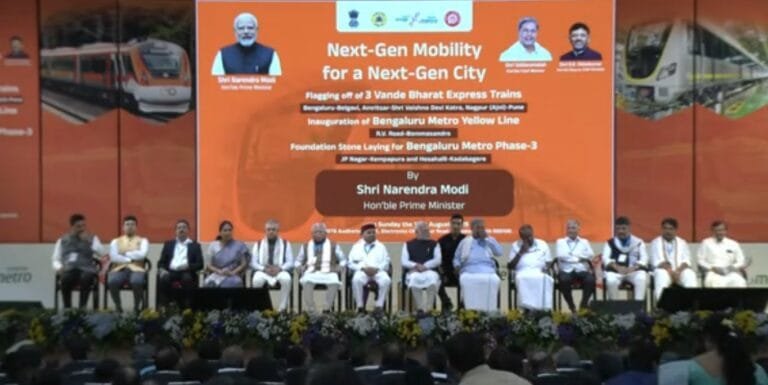 प्रधानमंत्री नरेन्द्र मोदी ने आज कर्नाटक के बेंगलुरु में लगभग 7,160 करोड़ रुपये की लागत वाली बेंगलुरु मेट्रो की येलो लाइन का उद्घाटन और 15,610 करोड़ रुपये से अधिक की लागत वाली बेंगलुरु मेट्रो चरण-3 परियोजना की आधारशिला रखी। उन्होंने बेंगलुरु के केएसआर रेलवे स्टेशन पर तीन वंदे भारत एक्सप्रेस ट्रेनों को भी हरी झंडी दिखाई।