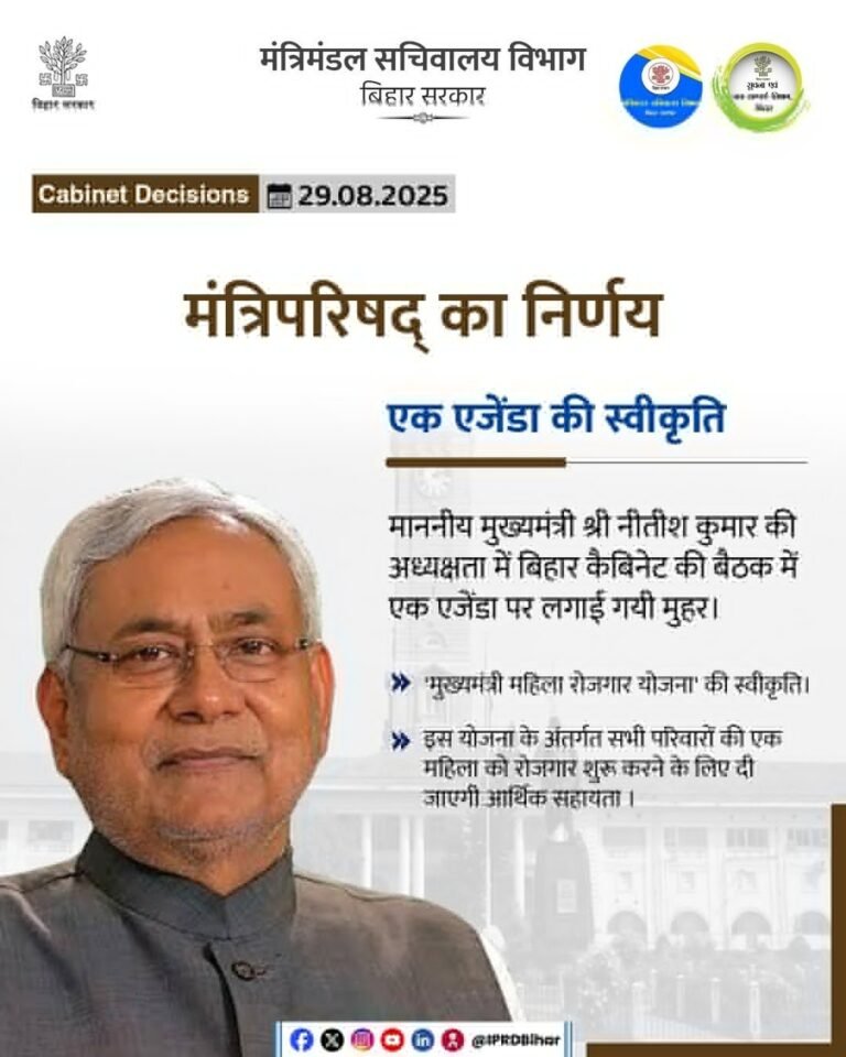 बिहार सरकार ने महिलाओं को रोजगार के अवसर देने के लिए एक नई योजना को मंजूरी दी है। मुख्यमंत्री नीतीश कुमार की अध्यक्षता में हुई मंत्रिमंडल की बैठक में मुख्यमंत्री महिला रोजगार योजना को स्वीकृति दी गई। इसके अंतर्गत राज्य के प्रत्येक परिवार की एक महिला को अपनी पसंद का रोजगार शुरू करने के लिए वित्तीय सहायता दी जाएगी। वित्तीय मदद की पहली किस्त में चुनी गई प्रत्येक महिला को अपना रोजगार शुरू करने के लिए दस हजार रूपये दिए जाएंगे।