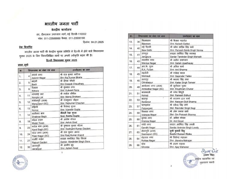 दिल्ली भाजपा के पूर्व प्रमुख सतीश उपाध्याय मालवीय नगर विधानसभा सीट से चुनाव लड़ेंगे और पूर्व आप नेता कैलाश गहलोत, जो हाल ही में भाजपा में शामिल हुए हैं, बिजवासन सीट से चुनाव लड़ेंगे। अरविंदर सिंह लवली गांधी नगर सीट से जबकि भाजपा नेता मनजिंदर सिंह सिरसा को राजौरी गार्डन विधानसभा क्षेत्र से टिकट दिया गया है। विजेंद्र गुप्ता रोहिणी विधानसभा सीट से पार्टी के उम्मीदवार होंगे।