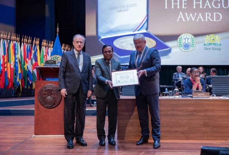 2013 में, रासायनिक हथियारों को खत्म करने के व्यापक प्रयासों के लिए ओपीसीडब्ल्यू को नोबेल शांति पुरस्कार से सम्मानित किया गया था। इस उपलब्धि की विरासत को संरक्षित करने के लिए, ओपीसीडब्ल्यू ने 2014 में हेग नगरपालिका के सहयोग से ‘ओपीसीडब्ल्यू-द हेग पुरस्कार’ की स्थापना की। यह पुरस्कार उन व्यक्तियों और संगठनों को मान्यता देता है जो रासायनिक हथियार सम्मेलन के लक्ष्यों को आगे बढ़ाने में महत्वपूर्ण भूमिका निभाते हैं।