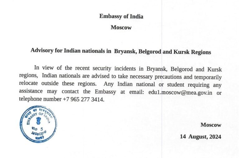 भारतीय दूतावास ने रूस के ब्रायंस्क, बेलगोरोद और कुर्स्क क्षेत्रों में रहने वाले छात्रों समेत अपने नागरिकों को सुरक्षित स्थानों पर अस्थायी रूप से चले जाने के लिये बुधवार को परामर्श जारी किया है।