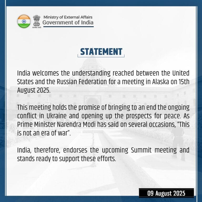 भारत ने अमरीका और रूस के बीच 15 अगस्त को अलास्का में होने वाली बैठक का स्वागत किया है। विदेश मंत्रालय ने एक बयान जारी कर कहा कि यह बैठक रूस और यूक्रेन के बीच जारी संघर्ष को समाप्त करने और शांति स्थापित करने की दिशा में महत्वपूर्ण कदम है। बयान में इस बात का भी उल्लेख किया गया है कि प्रधानमंत्री मोदी ने भी कई बार कहा है कि यह युद्ध का युग नहीं है।