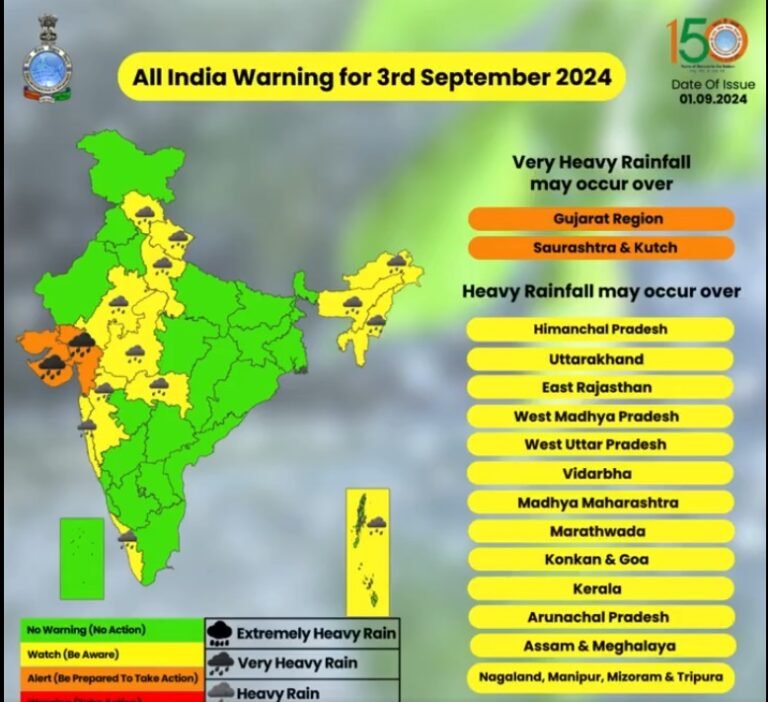 मौसम विभाग (IMD) ने देश के पश्चिमी, मध्य और दक्षिणी हिस्सों में मूसलाधार बारिश की चेतावनी जारी की है। विभाग ने कहा कि विदर्भ और तेलंगाना क्षेत्र में आज मूसलाधार बारिश होने की संभावना है और असम, तटीय आंध्र प्रदेश, यनम, केरल, माहे, तेलंगाना में अलग-अलग स्थानों पर मूसलाधार बारिश होने की संभावना है। पूर्वी राजस्थान, मध्य प्रदेश, छत्तीसगढ़, ओडिशा, अरुणाचल प्रदेश, मेघालय, हिमाचल प्रदेश, तमिलनाडु, पुडुचेरी, कराईकल और रायलसीमा के कुछ हिस्सों में भी आज भारी बारिश होने की संभावना है।