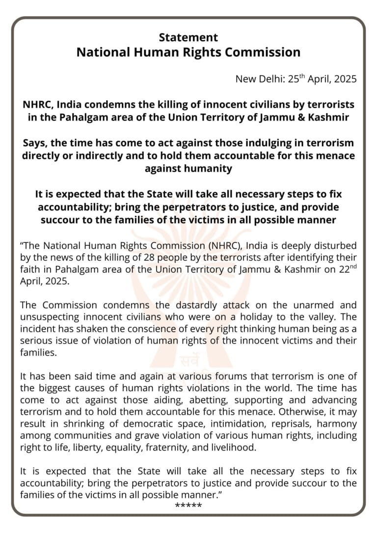 राष्ट्रीय मानवाधिकार आयोग (एनएचआरसी) 22 अप्रैल, 2025 को केंद्र शासित प्रदेश जम्मू और कश्मीर के पहलगाम में आतंकवादियों द्वारा उनकी आस्था की पहचान करने के बाद 28 लोगों की हत्या की खबर से बहुत व्यथित है।