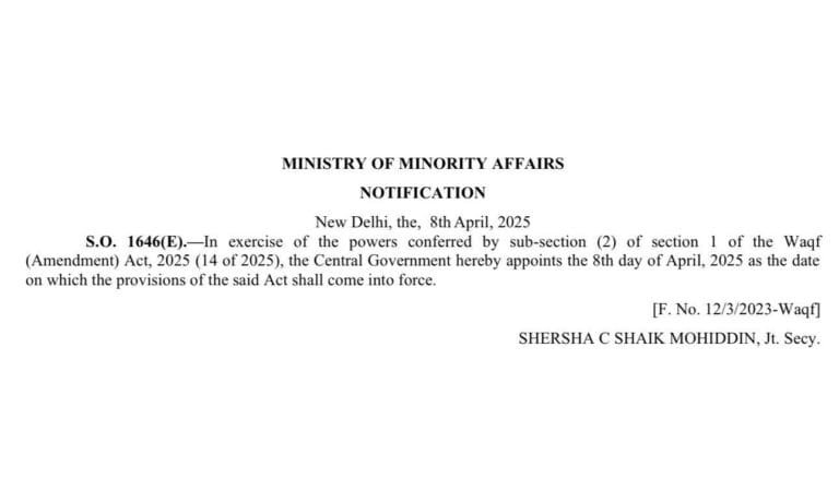 वक्फ (संशोधन) अधिनियम, 2025 आज से लागू हो गया है। राष्ट्रपति द्रौपदी मुर्मु द्वारा विधेयक को मंजूरी दिए जाने के बाद सरकार ने इस आशय की अधिसूचना जारी कर दी है। नए कानून का उद्देश्य वक्फ संपत्तियों के प्रबंधन को सुव्यवस्थित करना है, जिसमें विरासत स्थलों की सुरक्षा और सामाजिक कल्याण को बढ़ावा देने के प्रावधान हैं। इसका उद्देश्य संपत्ति प्रबंधन में पारदर्शिता बढ़ाकर, वक्फ बोर्डों और स्थानीय अधिकारियों के बीच समन्वय को सुव्यवस्थित करना और हितधारकों के अधिकारों की रक्षा करना भी शामिल है।