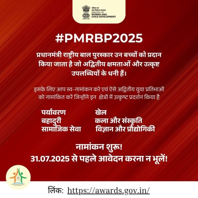 भारत सरकार ने प्रधानमंत्री राष्ट्रीय बाल पुरस्कार (पीएमआरबीपी) 2025 के लिए नामांकन आमंत्रित किए हैं। यह देश भर के बच्चों की असाधारण उपलब्धियों को मान्यता देने के लिए भारत के राष्ट्रपति द्वारा प्रतिवर्ष प्रदान किया जाने वाला एक प्रतिष्ठित राष्ट्रीय स्तर का पुरस्कार है। नामांकन प्रस्तुत करने की अंतिम तिथि 31 जुलाई 2025 है। सभी नामांकन आधिकारिक राष्ट्रीय पुरस्कार पोर्टल https://awards.gov.in के माध्यम से ऑनलाइन प्रस्तुत किए जाने चाहिए।