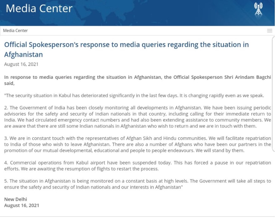प्रवक्ता ने कहा कि भारत, अफगान सिख और हिंदू समुदायों के प्रतिनिधियों से लगातार संपर्क बनाए हुए है। उन्होंने कहा कि काबुल में पिछले कुछ दिनों में सुरक्षा स्थिति काफी खराब हुई है। भारत सरकार अफगानिस्तान के घटनाक्रम पर पूरी नजर बनाए हुई है। वह समय-समय पर अफगानिस्तान में भारतीय नागरिकों की सुरक्षा के लिए परामर्श जारी करती रही है और उन्हें तुरंत स्वदेश लौटने के लिए कहती रही है। विदेश मंत्रालय ने आपात स्थिति में संपर्क के लिए टेलीफोन नंबर जारी किया है। अरिन्दम बागची ने बताया कि स्वदेश लौटने के इच्छुक कुछ भारतीय नागरिक अब भी अफगानिस्तान में हैं और वे उनसे संपर्क बनाए हुए हैं।