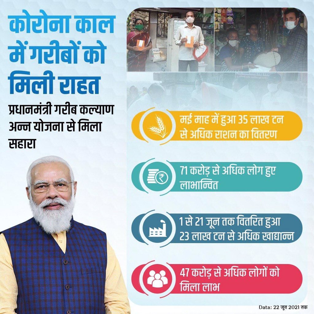 केंद्र सरकार की एजेंसी भारतीय खाद्य निगम ने सभी 36 राज्यों और केंद्रशासित प्रदेशों को 21 जून 2021 तक 76.72 लाख मीट्रिक टन मुफ्त खाद्यान्न की आपूर्ति की है। 22 राज्यों और केंद्रशासित प्रदेशों अर्थात आंध्र प्रदेश, अरुणाचल प्रदेश, चंडीगढ़, छत्तीसगढ़, दिल्ली, गोवा, गुजरात, हिमाचल प्रदेश, झारखंड, कर्नाटक, केरल, लक्षद्वीप, मणिपुर, मेघालय, मिजोरम, नागालैंड, पुद्दुचेरी, पंजाब, तमिलनाडु, तेलंगाना, त्रिपुरा एवं पश्चिम बंगाल ने मई-जून 2021 के लिए आवंटित संपूर्ण खाद्यान्न उठा लिया है।