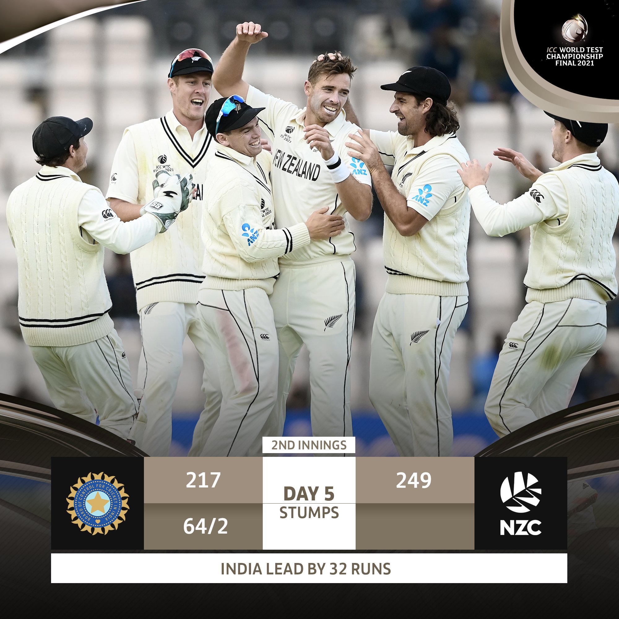 साउथैम्पटन में भारत और न्यूजीलैण्ड के बीच विश्व टेस्ट चैम्पियनशिप के फाइनल में भारत ने कल पांचवें दिन दूसरी पारी में दो विकेट पर 64 रन बनाकर 32 रन की बढ़त हासिल कर ली है। आज छठे दिन अच्छे मौसम का अनुमान है, लेकिन मैच ड्रा होने पर दोनों टीमों को संयुक्त विजेता घोषित किया जाएगा।