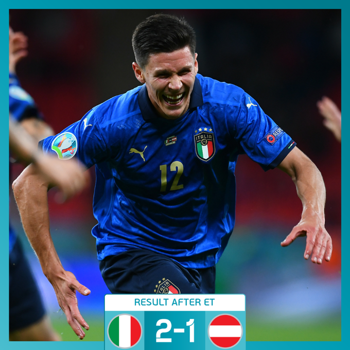 एक अन्य मैच में इटली ने ऑस्ट्रिया को अतिरिक्त समय में दो-एक से हराकर क्वार्टर फाइनल में प्रवेश किया। क्वार्टर फाइनल में इटली का मुकाबला अगले शुक्रवार को म्यूनिख में बेल्जियम या पुर्तगाल से होगा।