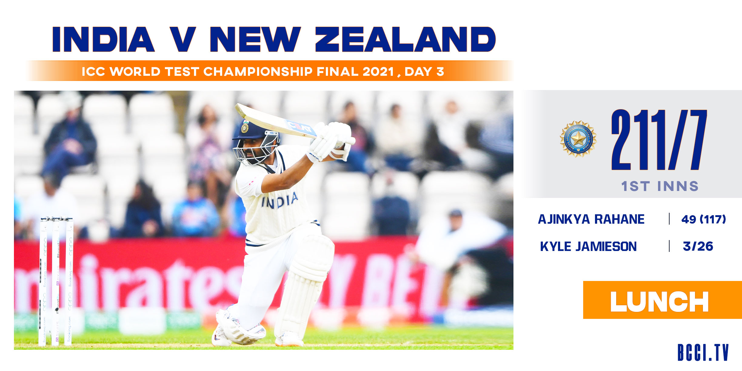 भारत और न्यूजीलैंड के बीच खेले जा रहे वर्ल्ड टेस्ट चैंपियनशिप फाइनल में भारतीय क्रिकेट टीम पहली पारी में 217 रन पर ऑल आउट हुई। मैच इंग्लैंड में साउथैम्पटन के एजेस बाउल स्टेडियम में खेला जा रहा है। कल खराब रोशनी के कारण 64 ओवर और 4 गेंद का ही खेल हो सका।