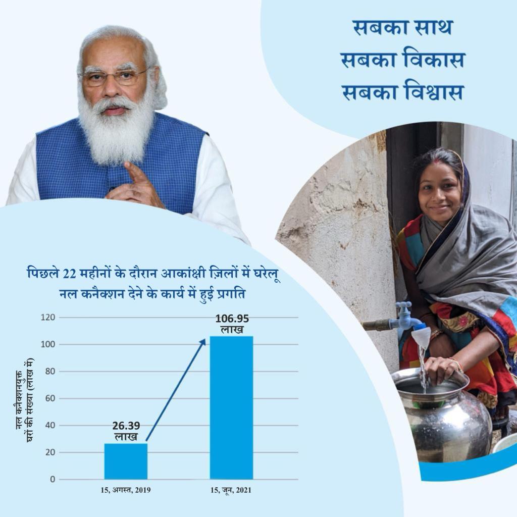 2019 में मिशन की शुरुआत में, देश के कुल 19.20 करोड़ ग्रामीण परिवारों में से केवल 3.23 करोड़ (17 प्रतिशत) के पास नल के पानी की आपूर्ति थी। पिछले 22 महीनों के दौरान, कोविड-19 महामारी और लॉकडाउन व्यवधानों के बावजूद, जल जीवन मिशन को तेजी से लागू किया गया है और 4.32 करोड़ घरों को पाइप कनेक्शन प्रदान किया गया है। कवरेज में 22 प्रतिशत की वृद्धि के साथ, वर्तमान में देश भर में 7.56 करोड़ (39.38 प्रतिशत) ग्रामीण घरों में नल के पानी की आपूर्ति है। गोवा, तेलंगाना, अंडमान और निकोबार द्वीप समूह और पुडुचेरी ने ग्रामीण क्षेत्रों में 100 प्रतिशत घरेलू कनेक्शन का लक्ष्य हासिल कर लिया है और ‘हर घर जल’ का मिशन पूरा हुआ है। प्रधानमंत्री के ‘सबका साथ, सबका विकास, सबका विश्वास’ के सिद्धांत का पालन करते हुए, मिशन का आदर्श वाक्य है ‘कोई भी छूटे नहीं’ और गांव के हर घर को नल का पानी उपलब्ध हो। वर्तमान में 62 जिलों और 93 हजार से अधिक गांवों में हर घर में नल का पानी पहुंच रहा है।