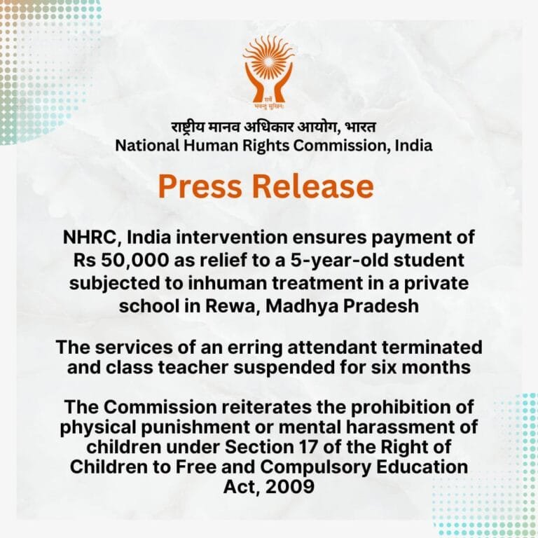 राष्ट्रीय मानवाधिकार आयोग (एनएचआरसी) की अनुशंसा पर मध्यप्रदेश के रीवा जिले में एक निजी विद्यालय में शिक्षक और कर्मचारियों द्वारा पांच वर्षीय छात्र के साथ किए गए अमानवीय व्यवहार के मामले में राज्य सरकार ने पीड़ित को 50,000 रुपये की सहायता राशि प्रदान की है। आयोग द्वारा जिलाधीश को नोटिस और शर्तानुसार समन भेजे जाने के पश्चात यह सूचित किया गया कि दोषी अटेंडेंट की सेवा समाप्त कर दी गई है और कक्षा शिक्षक को छह माह के लिए निलंबित कर दिया गया है।
