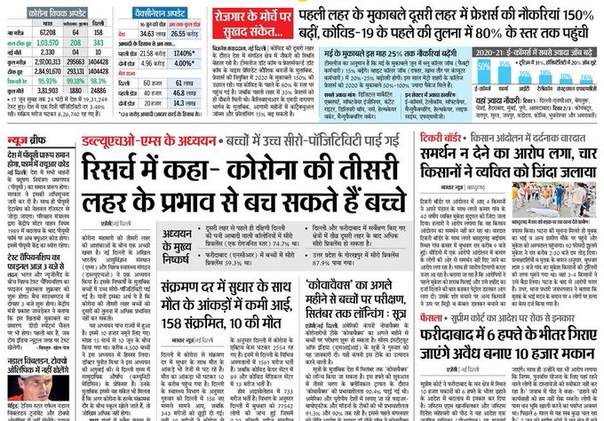 कोरोना फ्रंटलाइन वर्कर को मिलेगी सौगात – प्रधानमंत्री लांच करेंगे कस्टमाइज्ड क्रैश कोर्स, हरिभूमि की पहली खबर है। पत्र कहता है -इस कार्यक्रम की शुरुआत 26 राज्यों में फैले 111 ट्रैनिंग सेंटर में होगी।