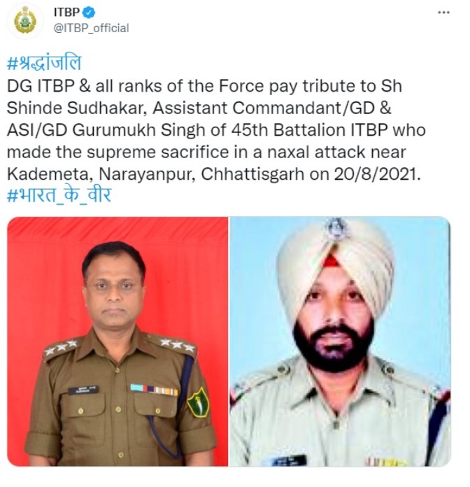 छत्तीसगढ़ में बस्तर क्षेत्र के नारायणपुर जिले में माओवादियों के हमले में भारत-तिब्बत सीमा पुलिस-आईटीबीपी के दो जवान शहीद हो गए। बस्तर रेंज के पुलिस महानिरीक्षक सुन्दर राज ने बताया कि सुरक्षा बलों के काडेमेता शिविर से छह सौ मीटर की दूरी से माओवादियों ने 45वीं बटालियन के आईटीबीपी कर्मियों पर उस समय हमला किया जब वे तलाश अभियान पर थे। हमले के बाद माओवादी जवानों से ए के-47 राइफल, दो बुलट प्रूफ जाकेट और एक वॉकीटॉकी छीन कर ले गए। पुलिस ने इलाके से नक्सलियों को खदेडने के लिए इलाके में तलाश अभियान शुरू कर दिया है।